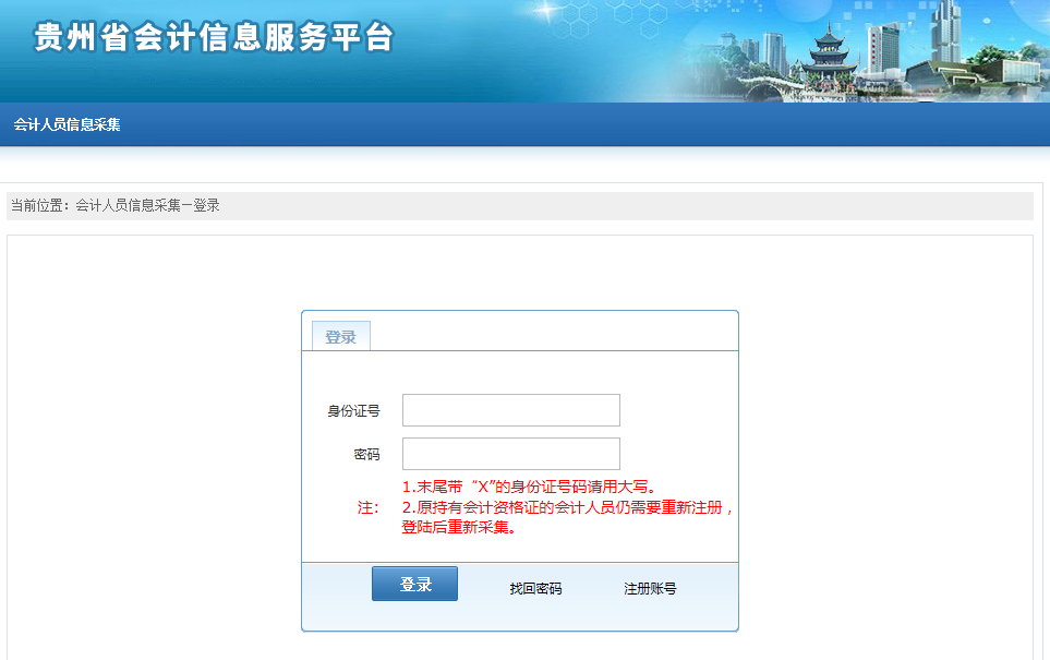 貴州信息采集由會(huì)計(jì)人員登錄“貴州財(cái)政會(huì)計(jì)網(wǎng)”(http://42.123.101.56:7001)自行網(wǎng)上填報(bào)(或修改)并上傳相關(guān)資料。