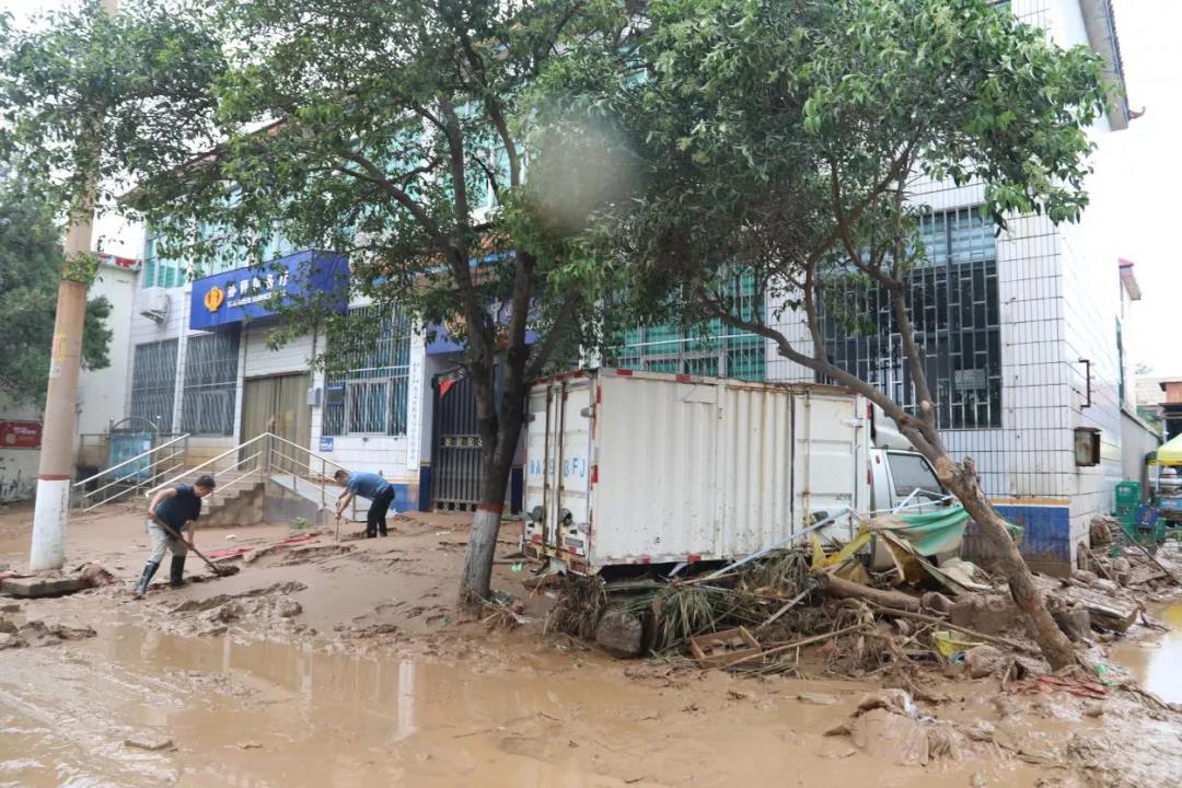 圖為洪水退去后在米河稅務(wù)分局后院留下大量淤泥,院墻和車輛被損毀。