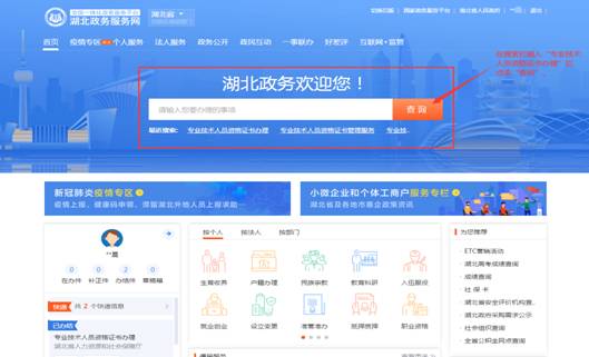 1.進(jìn)入湖北政務(wù)服務(wù)網(wǎng)(zwfw.hubei.gov.cn),注冊成功并登陸,在政務(wù)網(wǎng)首頁搜索欄搜索“專業(yè)技術(shù)人員資格證書辦理”。