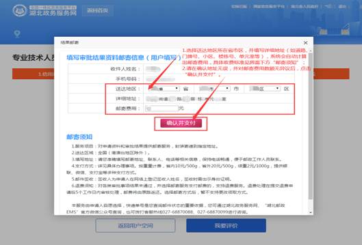 11.選擇送達(dá)地區(qū)所在省市區(qū),并填寫詳細(xì)地址(如道路、門牌號、小區(qū)、樓棟號、單元室等),系統(tǒng)會自動計算出郵寄費用,具體收費標(biāo)準(zhǔn)見界面下方“郵寄須知”;請在確認(rèn)地址無誤,并對郵寄費用數(shù)額無異議后,點擊“確認(rèn)并支付”。