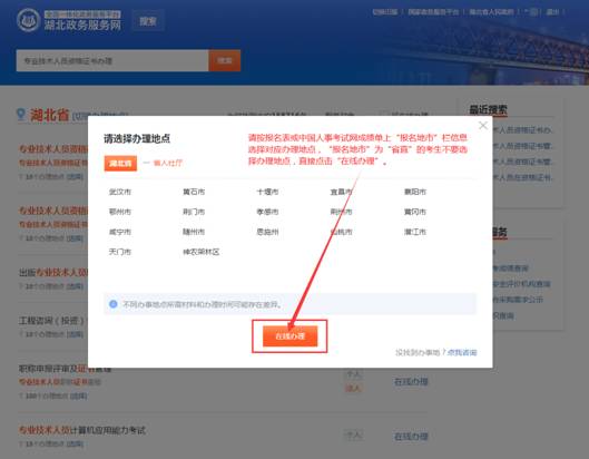3.在如下界面,考生按報名表或中國人事考試網(wǎng)成績單上“報名地市”欄中信息選擇對應(yīng)辦理地點,“報名地市”為“省直”的考生不要選擇辦理地點,直接點擊“在線辦理”。