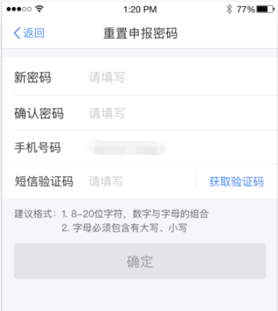 3.申報(bào)密碼的格式要求為:大小寫字母與數(shù)字8-20位的字符組合,不允許含有空格。