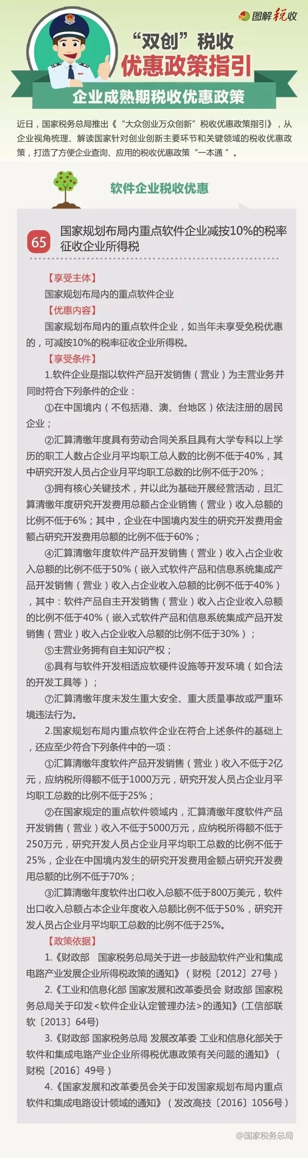 近日,國家稅務(wù)總局推出《“大眾創(chuàng)業(yè)萬眾創(chuàng)新”稅收優(yōu)惠政策指引》,我們將陸續(xù)編發(fā)稅收優(yōu)惠政策的具體內(nèi)容。今天發(fā)布企業(yè)成熟期稅收優(yōu)惠政策之軟件企業(yè)稅收優(yōu)惠:國家規(guī)劃布局內(nèi)重點軟件企業(yè)減按10%的稅率征收企業(yè)所得稅。