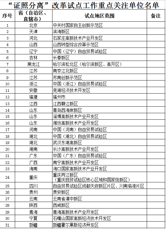 工商總局發(fā)布《關(guān)于加快推進“證照分離”改革試點工作的通知》,結(jié)合各地改革推進情況,選取了31個“證照分離”改革試點工作重點關(guān)注單位。