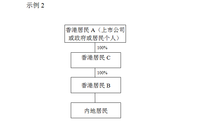 示例2投資架構,香港居民B投資內地居民并取得股息時,香港居民A通過香港居民C間接持有香港居民B100%股份,如果香港居民A為香港政府、香港居民且在香港上市的公司或香港居民個人,可直接判定香港居民B具有“受益所有人”身份。