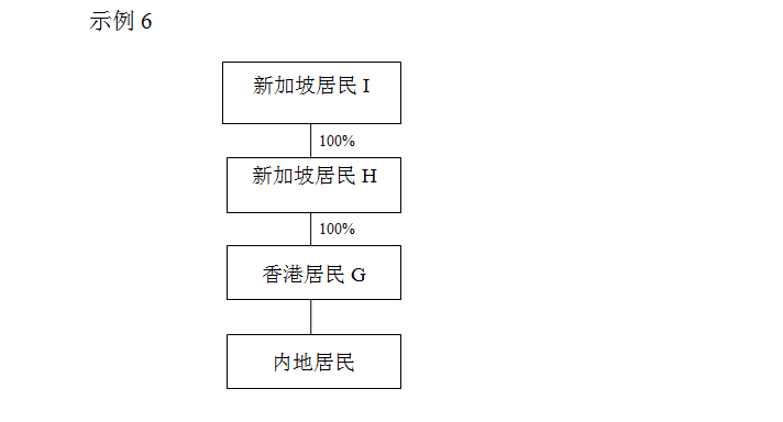 示例6投資架構,為本條第一款第(二)項規(guī)定的情形,香港居民G投資內地居民并取得股息,新加坡居民I通過新加坡居民H間接持有香港居民G100%的股份,雖然香港居民G不符合“受益所有人”條件,但是,如果新加坡居民I符合“受益所有人”條件,并且新加坡居民I和新加坡居民H從中國取得的所得為股息時,根據(jù)中國與新加坡簽署的稅收協(xié)定可享受的稅收協(xié)定待遇均和香港居民G可享受的稅收協(xié)定待遇相同,應認為香港居民G具有“受益所有人”身份,香港居民G可根據(jù)內地與香港簽署的稅收安排享受稅收協(xié)定待遇。