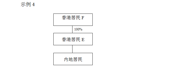 示例4投資架構,為本條第一款第(一)項規(guī)定的情形,香港居民E投資內地居民并取得股息,香港居民F直接持有香港居民E100%的股份,雖然香港居民E不符合“受益所有人”條件,但是,如果香港居民F符合“受益所有人”條件,應認為香港居民E具有“受益所有人”身份;