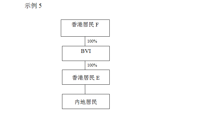 示例5投資架構,為本條第一款第(一)項規(guī)定的情形,香港居民E投資內地居民并取得股息,香港居民F通過在BVI注冊成立的公司(不論該公司是否為香港居民)間接持有香港居民E100%的股份,雖然香港居民E不符合“受益所有人”條件,但是,如果香港居民F符合“受益所有人”條件,應認為香港居民E具有“受益所有人”身份;