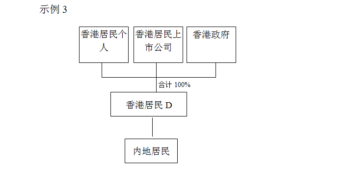 示例3投資架構,香港居民D投資內地居民并取得股息,直接持有香港居民D100%股份的人為香港政府、香港居民且在香港上市的公司或香港居民個人,可直接判定香港居民D具有“受益所有人”身份。
