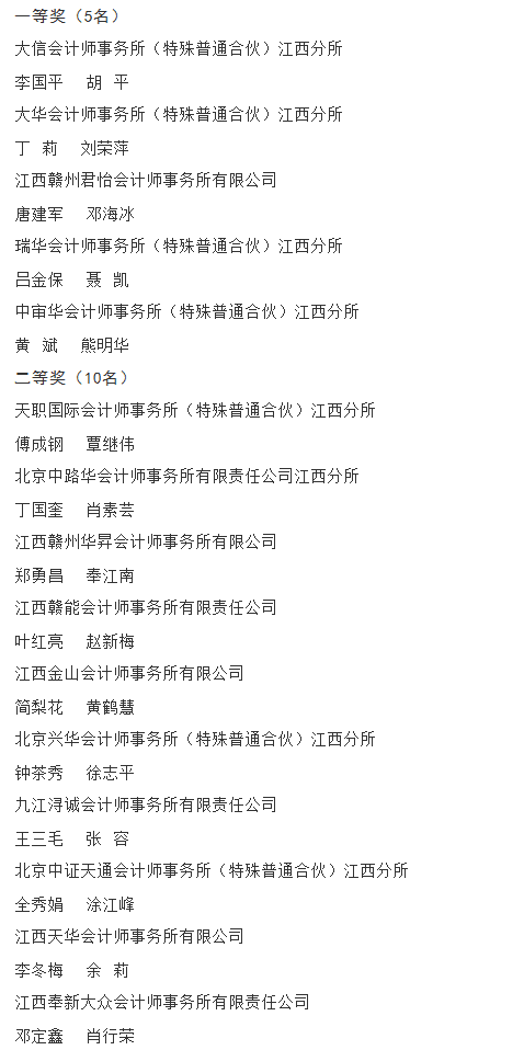 為進(jìn)一步規(guī)范會計(jì)師事務(wù)所執(zhí)業(yè)行為,提升行業(yè)執(zhí)業(yè)質(zhì)量,推動行業(yè)科學(xué)發(fā)展,江西省注冊會計(jì)師行業(yè)黨委、省注冊會計(jì)師協(xié)會在全省注冊會計(jì)師行業(yè)內(nèi)組織開展了2017年執(zhí)業(yè)質(zhì)量競賽活動。根據(jù)《江西省注冊會計(jì)師行業(yè)創(chuàng)先爭優(yōu)執(zhí)業(yè)質(zhì)量評比辦法》的規(guī)定,經(jīng)專家評比打分,評選出一等獎5名,二等獎10名,三等獎15名,F(xiàn)將獲獎會計(jì)師事務(wù)所及簽字注冊會計(jì)師名單公布如下: