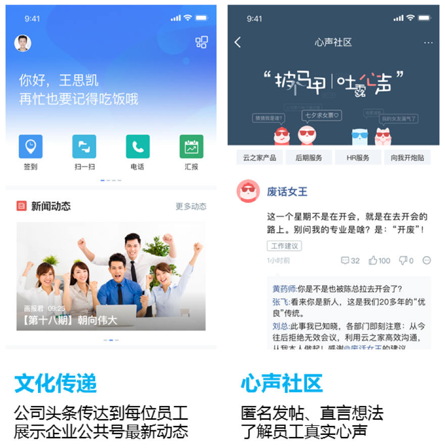在同事圈“心聲社區(qū)”板塊,員工可以通過匿名方式表達(dá)情感、反饋問題;智能助理“小云”可將高票答案推送給公司管理層,可作為決策參考。員工可以在同事圈搶占“公司頭條”,或是自定義標(biāo)語在云之家首頁進(jìn)行展現(xiàn),塑造個(gè)人品牌。新版同事圈還提供“多屏聯(lián)動(dòng)”方案,讓公司所有屏幕都展現(xiàn)同一內(nèi)容,實(shí)現(xiàn)企業(yè)文化“一鍵上墻”。