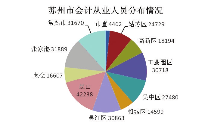 會計是現(xiàn)代服務(wù)業(yè)的重要分支行業(yè),截至2017年底,蘇州市登記從業(yè)的會計人員共計273449人。其中,昆山會計從業(yè)人員最多,有42238人,張家港以31889人、常熟以31670人緊隨其后,吳江區(qū)為30863人,工業(yè)園區(qū)為30718人,吳中區(qū)27480人,姑蘇區(qū)24729人,高新區(qū)18194人,太倉16607人,相城區(qū)14599人,市直管會計4462人。