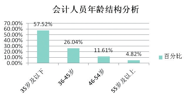 在所有登記從業(yè)會計人員中,35歲及以下人數(shù)共139080人,占總?cè)藬?shù)的57.52%;36-45歲人數(shù)共62968人,占總?cè)藬?shù)的26.04%;46-54歲人數(shù)共28071人,占總?cè)藬?shù)的11.61%;55歲及以上人數(shù)共11660人,占總?cè)藬?shù)的4.82%。