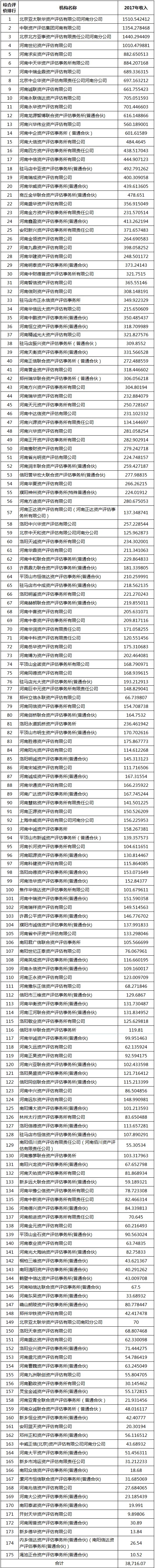 公示結(jié)果顯示,全省資產(chǎn)評(píng)估機(jī)構(gòu)2017年度業(yè)務(wù)總收入為38716.07萬(wàn)元。位列綜合評(píng)價(jià)前十名的為:北京亞太聯(lián)華資產(chǎn)評(píng)估有限公司河南分公司、中聯(lián)資產(chǎn)評(píng)估集團(tuán)河南有限公司、北京北方亞事資產(chǎn)評(píng)估有限責(zé)任公司河南分公司、河南世紀(jì)資產(chǎn)評(píng)估有限公司、河南求實(shí)資產(chǎn)評(píng)估有限公司、河南中天華資產(chǎn)評(píng)估事務(wù)所有限公司、河南中瑞金鼎資產(chǎn)評(píng)估有限公司、北京中企華資產(chǎn)評(píng)估有限責(zé)任公司河南分公司、河南誠(chéng)聯(lián)資產(chǎn)評(píng)估有限公司、河南永聯(lián)信達(dá)資產(chǎn)評(píng)估有限公司。
