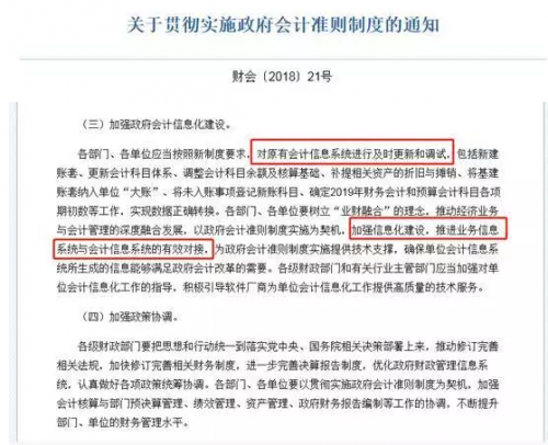 2018年8月財(cái)政部發(fā)布《關(guān)于貫徹實(shí)施政府會(huì)計(jì)準(zhǔn)則制度的通知》中指出,各部門(mén)、各單位需要“按照新制度要求,對(duì)原有會(huì)計(jì)信息系統(tǒng)進(jìn)行及時(shí)更新和調(diào)試”,“加強(qiáng)信息化建設(shè),推進(jìn)業(yè)務(wù)信息系統(tǒng)與會(huì)計(jì)信息系統(tǒng)的有效對(duì)接,為政府會(huì)計(jì)準(zhǔn)則制度實(shí)施提供技術(shù)支撐,確保單位會(huì)計(jì)信息系統(tǒng)所生成的信息能夠滿足政府會(huì)計(jì)改革的需要”。