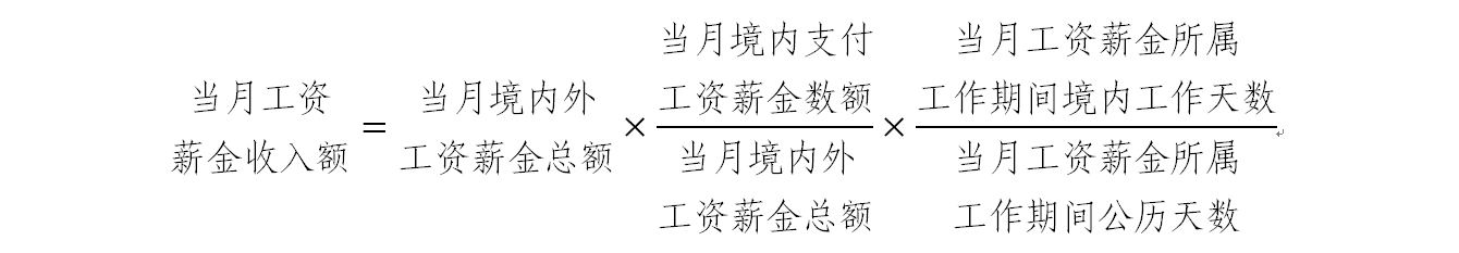在一個(gè)納稅年度內(nèi),在境內(nèi)累計(jì)居住不超過90天的非居民個(gè)人,僅就歸屬于境內(nèi)工作期間并由境內(nèi)雇主支付或者負(fù)擔(dān)的工資薪金所得計(jì)算繳納個(gè)人所得稅。當(dāng)月工資薪金收入額的計(jì)算公式如下(公式一):