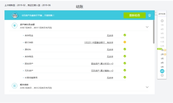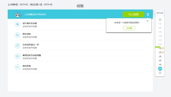 1. 通過【馬上檢查】,一鍵查看系統(tǒng)設(shè)定的5大類檢查項(xiàng):資產(chǎn)類、期末結(jié)轉(zhuǎn)、往來款項(xiàng)掛賬情況、費(fèi)用控制納稅調(diào)整、其他異常;