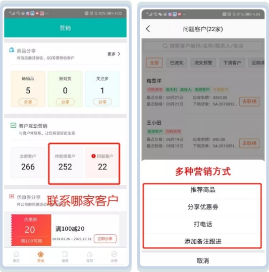 主動(dòng)營(yíng)銷贏客戶,智能推薦針對(duì)性聯(lián)絡(luò)方式。根據(jù)不同客戶分類情況,采用不同的營(yíng)銷跟進(jìn)方式:業(yè)務(wù)員及老板,查看價(jià)值客戶或問題客戶后,根據(jù)客戶的交易頻次、系統(tǒng)標(biāo)簽了解客戶的實(shí)際購(gòu)買情況,針對(duì)性給客戶打電話;推薦商品、優(yōu)惠券;或者聯(lián)系客戶安排一次上門拜訪。針對(duì)性推薦客戶心儀的商品,有利于客單價(jià)的提高,促進(jìn)店鋪銷量。