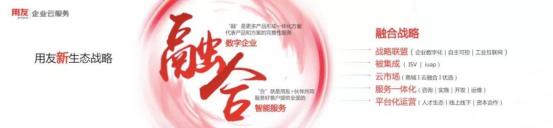 相比于信息時代的“管控”,數字時代更強調“開放”。一個組織力量再大,總有邊界和局限。生態(tài)繁榮強大每個成員,更能為客戶創(chuàng)造單一組織不能企及的價值。會上,用友發(fā)布新生態(tài)戰(zhàn)略“融合”:融,代表“墻”的消融,用友和伙伴的產品方案融為一體,形成完整的企業(yè)數字化解決方案;合,代表用友和伙伴共同服務好客戶,為企業(yè)提供全面的智能服務。“融合”戰(zhàn)略五大策略方向,分別為戰(zhàn)略聯(lián)盟、被集成、云市場、服務一體化、平臺化運營。