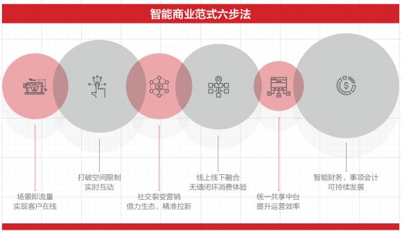 而在推進(jìn)小微企業(yè)服務(wù)過(guò)程中,暢捷通總結(jié)出了“智能商業(yè)范式六步法”。這個(gè)六步法,基本上是場(chǎng)景即流量,實(shí)現(xiàn)客戶(hù)的在線(xiàn),通過(guò)多個(gè)維度、多種方式的形式收集客戶(hù)的流量,在這個(gè)場(chǎng)景收集客戶(hù)流量,使企業(yè)能夠跟它的客戶(hù)實(shí)現(xiàn)實(shí)時(shí)在線(xiàn)的連接。
