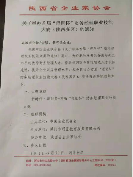 9月,由中國(guó)企業(yè)聯(lián)合會(huì)主辦,陜西省企業(yè)家協(xié)會(huì)協(xié)辦,理臣教育承辦,中國(guó)會(huì)計(jì)網(wǎng)、大象慧云、佳保信息、李時(shí)珍集團(tuán)等機(jī)構(gòu)參與的陜西省財(cái)務(wù)經(jīng)理大賽暨首屆“理臣杯”中國(guó)財(cái)務(wù)經(jīng)理大賽(陜西賽區(qū))正式拉開(kāi)帷幕。