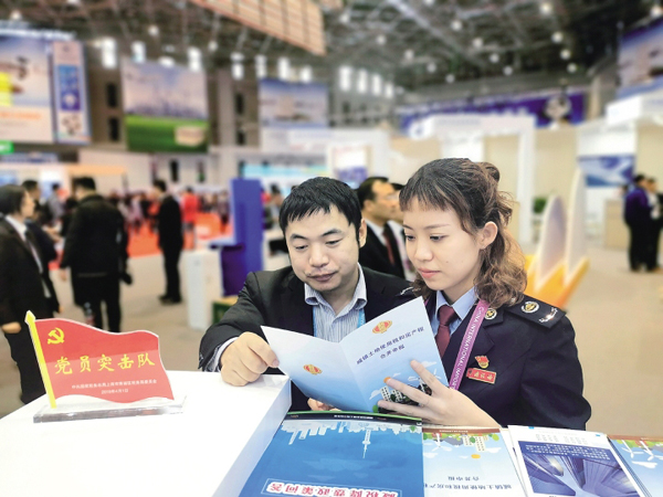 上海市稅務(wù)部門黨員突擊隊在中國國際進口博覽會現(xiàn)場,提供稅收政策咨詢服務(wù)。