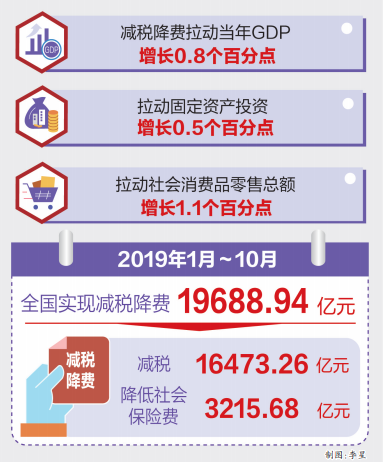12月25日,十三屆全國(guó)人大常委會(huì)第十五次會(huì)議召開(kāi)全體會(huì)議,審議國(guó)務(wù)院關(guān)于減稅降費(fèi)工作情況的報(bào)告。報(bào)告指出,按照黨中央、國(guó)務(wù)院決策部署,今年出臺(tái)了有史以來(lái)力度最大、規(guī)?涨暗臏p稅降費(fèi)政策,目前各項(xiàng)減稅降費(fèi)措施落實(shí)有力,效果正在逐步顯現(xiàn)。據(jù)財(cái)稅部門(mén)測(cè)算,減稅降費(fèi)拉動(dòng)當(dāng)年GDP增長(zhǎng)0.8個(gè)百分點(diǎn)。