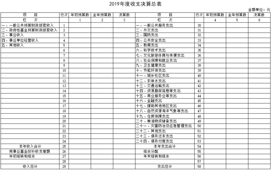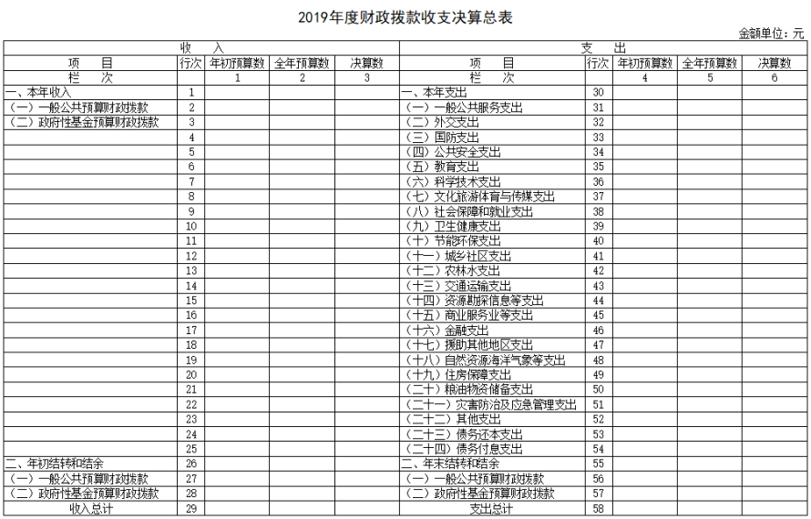 收支決算總表反映部門各項收入、支出和結(jié)轉(zhuǎn)結(jié)余情況,按年初預算數(shù)、全年預算數(shù)和決算數(shù)列示。