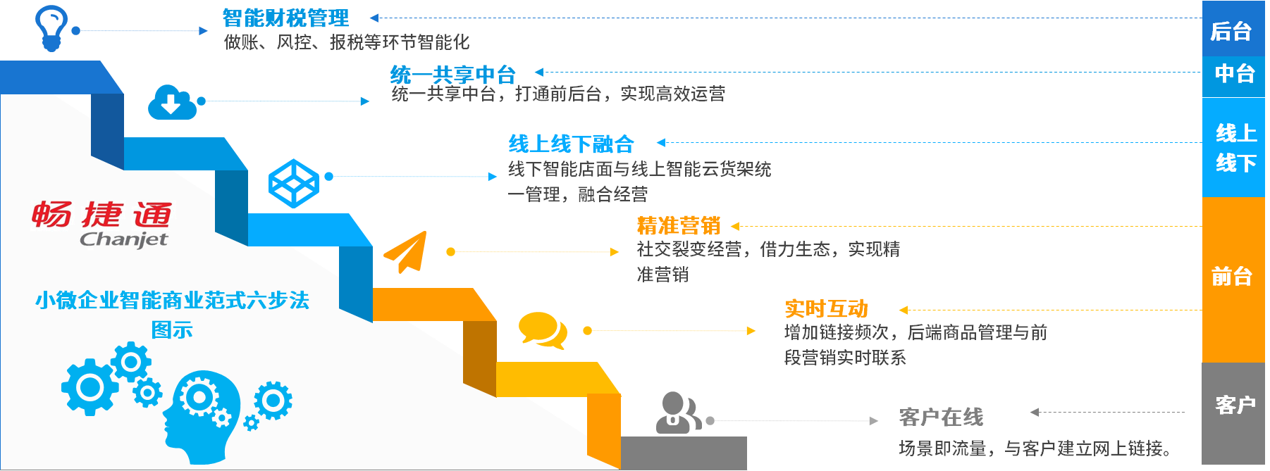 “商業(yè)范式六步法”從前端的客戶鏈接到后臺的智能財稅管理,提供了一整套的小微企業(yè)數(shù)字化轉(zhuǎn)型、智能+升級的解決方案。將引領(lǐng)行業(yè)服務(wù)商探索如何解決小微企業(yè)全面數(shù)字化升級面臨的相對重要且日益凸顯的各個方面問題,也引導(dǎo)小微企業(yè)借助云服務(wù)模式實(shí)現(xiàn)一體化運(yùn)營,使得數(shù)據(jù)、資源能夠以“數(shù)字化形態(tài)”在前臺、中臺、后臺、線上、線下等環(huán)節(jié)順暢流動。