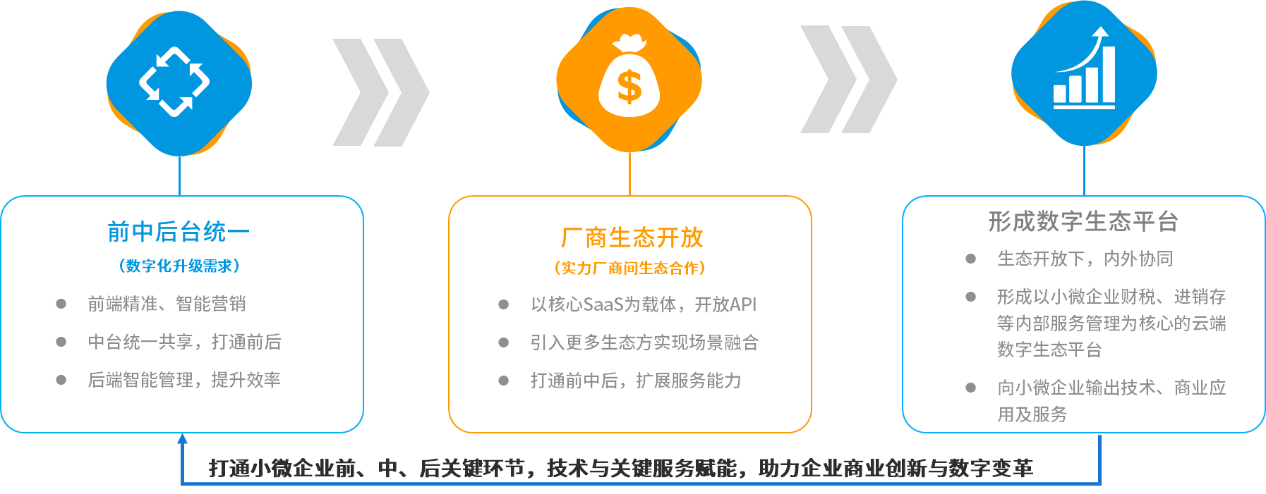 小微企業(yè)一體化運(yùn)營服務(wù)需求,需要前臺實(shí)現(xiàn)精準(zhǔn)、智能營銷,中臺實(shí)現(xiàn)統(tǒng)一共享、鏈接前后,后臺實(shí)現(xiàn)智能化管理、提升運(yùn)營效率,從而形成前中后臺的統(tǒng)一,滿足未來小微企業(yè)全面數(shù)字化升級需要,不僅如此,小微企業(yè)更需要借助云服務(wù)賦予的數(shù)字化能力優(yōu)化自身創(chuàng)新力,從而提升自身的競爭、生存能力。