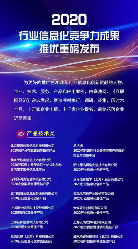 “行業(yè)信息化技術(shù)創(chuàng)新發(fā)展峰會(huì)”創(chuàng)辦于2018年,是每年科技界最具影響力的盛事之一。評(píng)選依據(jù)“行業(yè)信息化競(jìng)爭(zhēng)力評(píng)價(jià)指標(biāo)體系”,從技術(shù)、品牌、產(chǎn)品、解決方案等角度對(duì)企業(yè)情況進(jìn)行調(diào)查,通過(guò)專家組評(píng)審、專業(yè)媒體編輯推薦、賽迪顧問(wèn)、賽迪智庫(kù)行業(yè)研究等評(píng)選方式,對(duì)企業(yè)2020年創(chuàng)新成果進(jìn)行總結(jié),通過(guò)專家、媒體、第三方咨詢機(jī)構(gòu)等多角度評(píng)選出年度大獎(jiǎng)。