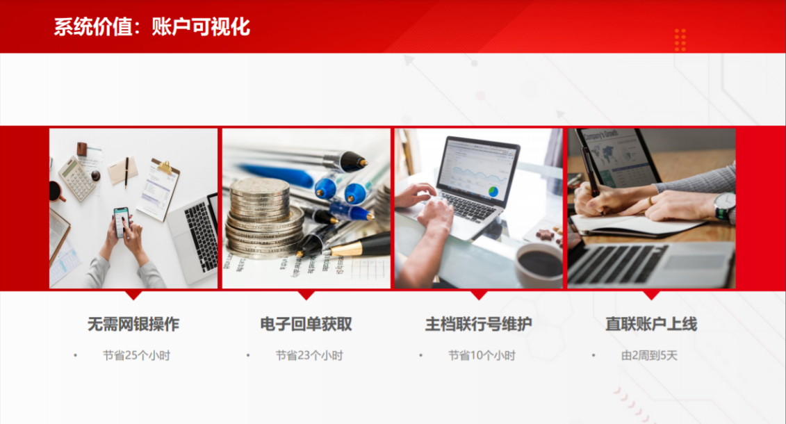 整體體系里,不需要通過銀行網銀,可以通過RPA機器人下載一些非直聯的數據,包括電子回單的獲取,都可以節(jié)約大量的人員績效。原來直聯賬戶上線每家銀行需要2周時間,現在5天就可以搞定。