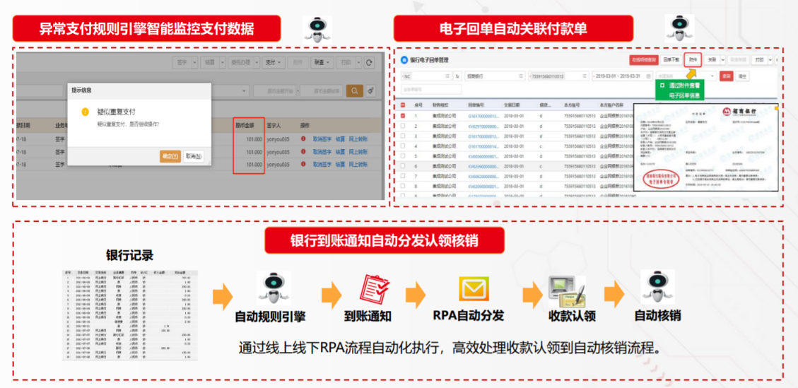 一,異常支付規(guī)則引擎智能監(jiān)控支付數據。也就是如何實現高效的,大批量的支付,并對支付數據給予風險的預警;二,電子回單自動關聯付款單。因為連鎖企業(yè)的支付筆數很多,回單量非常大,那么通過電子回單中,能減少大量手工勞動;三,銀行到賬通知自動分發(fā)認領核銷。營業(yè)收入每天要做稽核,稽核會涉及到銀行的流水。通過線上線下RPA流程自動化執(zhí)行,可以高效處理收款認領到自動核銷流程。