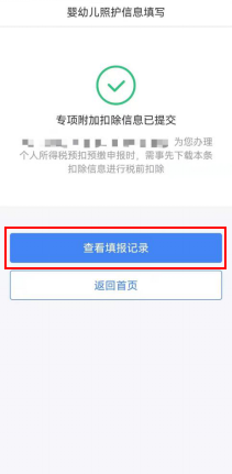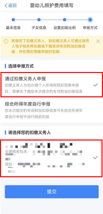 第五步,選擇申報(bào)方式。設(shè)置扣除比例后,進(jìn)入“申報(bào)方式”界面,納稅人可根據(jù)實(shí)際情況選擇“通過(guò)扣繳義務(wù)人申報(bào)”或“綜合所得年度自行申報(bào)”任意一種方式。如果納稅人需要在每月發(fā)放工資薪金時(shí)享受專項(xiàng)附加扣除,需要選擇“通過(guò)扣繳義務(wù)人申報(bào)”,并核實(shí)扣繳義務(wù)人信息是否準(zhǔn)確。選擇完成后,點(diǎn)擊“提交”,即完成3歲以下嬰幼兒照護(hù)專項(xiàng)附加扣除填報(bào)流程,系統(tǒng)將彈出“專項(xiàng)附加扣除信息已提交”的提示。納稅人可以點(diǎn)擊“查看填報(bào)記錄”查看已經(jīng)申報(bào)的專項(xiàng)附加扣除信息。