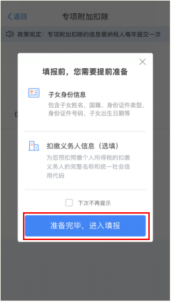 第二步,選擇扣除年度。進(jìn)入申報(bào)界面后,“選擇扣除年度”設(shè)為2022年,點(diǎn)擊“確認(rèn)”后,系統(tǒng)會(huì)提示需要提前準(zhǔn)備的資料,納稅人仔細(xì)閱讀后,點(diǎn)擊“準(zhǔn)備完畢,進(jìn)入填報(bào)”。