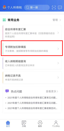 第一步,進(jìn)入申報(bào)界面。納稅人登錄手機(jī)個(gè)人所得稅APP后,可通過(guò)“首頁(yè)——常用業(yè)務(wù)——專項(xiàng)附加扣除填報(bào)”或“辦稅——專項(xiàng)附加扣除填報(bào)”進(jìn)入專項(xiàng)附加扣除填報(bào)界面,并選擇“嬰幼兒照護(hù)費(fèi)用”專項(xiàng)附加扣除。
