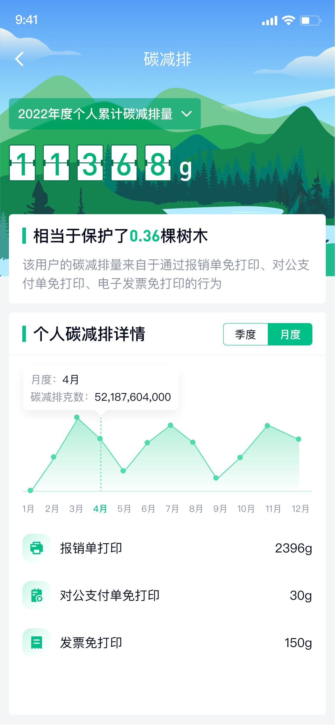 為了助力企業(yè)在財務(wù)管理領(lǐng)域進行綠色低碳轉(zhuǎn)型,培養(yǎng)員工在報銷和歸檔等場景節(jié)能減排的意識和習(xí)慣,匯聯(lián)易推出“碳減排”模塊。目前“碳減排”模塊支持“個人碳減排報表”和“企業(yè)碳減排報表”,覆蓋了單據(jù)免打印、電子發(fā)票免打印、免貼票、無紙化歸檔、檔案盒節(jié)省等場景。用戶可在app中進入碳減排子應(yīng)用,查看碳減排詳情以及累計碳減排對環(huán)境保護作出的貢獻,幫助企業(yè)積極響應(yīng)3060雙碳目標。