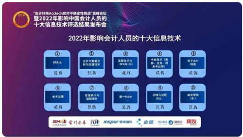 由上海國家會計(jì)學(xué)院主辦的“會計(jì)科技Acctech應(yīng)對不確定性挑戰(zhàn)”高峰論壇暨2022年影響中國會計(jì)人員的十大信息技術(shù)評選結(jié)果發(fā)布會”于8月1日評選出了2022年影響中國會計(jì)人員的十大信息技術(shù)分別是:財(cái)務(wù)云、會計(jì)大數(shù)據(jù)分析與處理技術(shù)、流程自動化(RPA和IPA)、中臺技術(shù)(數(shù)據(jù)、業(yè)務(wù)、財(cái)務(wù)中臺等)、電子會計(jì)檔案、電子發(fā)票、在線審計(jì)與遠(yuǎn)程審計(jì)、新一代ERP、在線與遠(yuǎn)程辦公、商業(yè)智能(BI)。