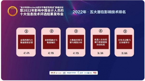 2022年五大潛在影響技術(shù)排名分別是:金稅四期與大數(shù)據(jù)稅收征管、業(yè)財(cái)稅融合與數(shù)據(jù)編織、大數(shù)據(jù)多維引擎與增強(qiáng)分析、機(jī)器人任務(wù)挖掘與智能超級自動化、分布式記賬與區(qū)塊鏈審計(jì)。