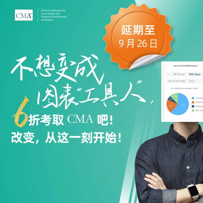 為持續(xù)助力中國廣大財務(wù)人士學(xué)習(xí)管理會計,提升職場核心競爭力,為企業(yè)創(chuàng)造更大價值,本次“改變,從這一刻開始,6折報考CMA”的優(yōu)惠活動的截止日期將延期至9月26日,點擊CMA官網(wǎng)進行報名。https://www.imachina.org.cn/22aug/promotion_2nd.html