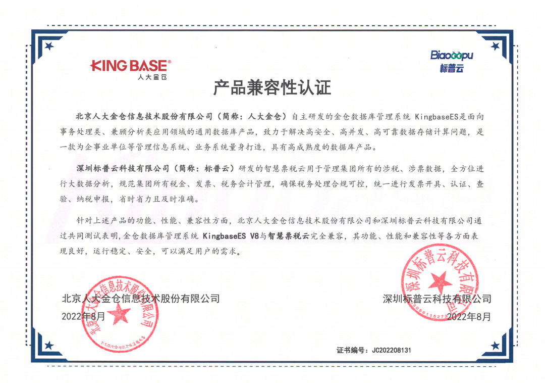 近日,深圳標(biāo)普云科技有限公司(以下簡(jiǎn)稱:標(biāo)普云)與北京人大金倉(cāng)信息技術(shù)股份有限公司(以下簡(jiǎn)稱:人大金倉(cāng))完成產(chǎn)品兼容性認(rèn)證。經(jīng)過(guò)雙方嚴(yán)格的共同測(cè)試,結(jié)果表明:標(biāo)普云智慧票稅云與金倉(cāng)數(shù)據(jù)管理系統(tǒng)KingbaseES完全兼容,其功能、性能和兼容性等各方面表現(xiàn)良好,運(yùn)行穩(wěn)定、安全,可以滿足用戶的需求。