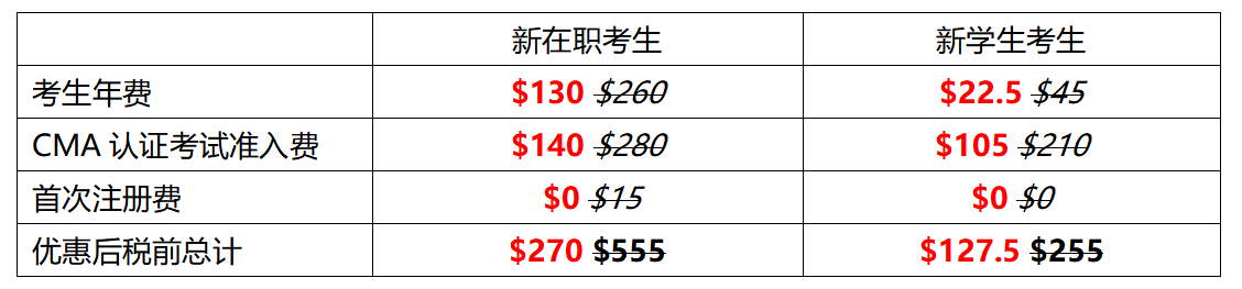 IMA管理會(huì)計(jì)師協(xié)會(huì)決定將于2023年1月5日至2月20日,對(duì)CMA新在職考生與新學(xué)生考生進(jìn)行優(yōu)惠活動(dòng),考生年費(fèi)5折,CMA認(rèn)證考試準(zhǔn)入費(fèi)5折,免除首次注冊(cè)費(fèi),在職考生共節(jié)省285美金,學(xué)生考生共節(jié)省127.5美金。參加此次報(bào)名的考生可享受2024年免年費(fèi)的活動(dòng),折扣代碼為:CMAWINCNS