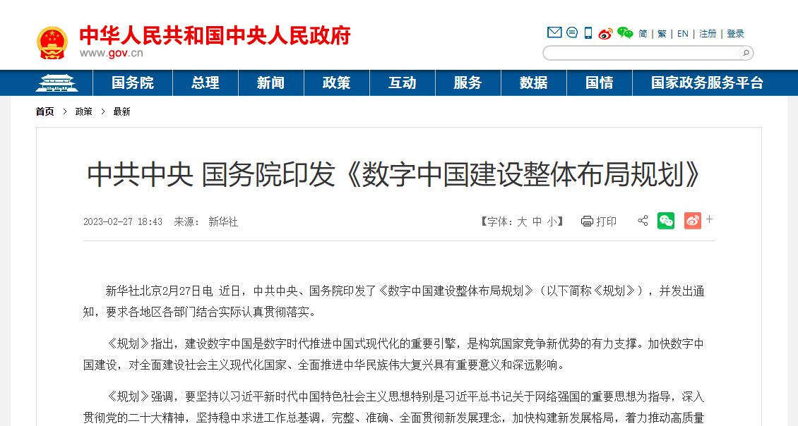 27日,中共中央、國(guó)務(wù)院印發(fā)了《數(shù)字中國(guó)建設(shè)整體布局規(guī)劃》(以下簡(jiǎn)稱(chēng)《規(guī)劃》)!兑(guī)劃》指出,建設(shè)數(shù)字中國(guó)是數(shù)字時(shí)代推進(jìn)中國(guó)式現(xiàn)代化的重要引擎,是構(gòu)筑國(guó)家競(jìng)爭(zhēng)新優(yōu)勢(shì)的有力支撐。到2025年,基本形成橫向打通、縱向貫通、協(xié)調(diào)有力的一體化推進(jìn)格局,數(shù)字中國(guó)建設(shè)取得重要進(jìn)展。