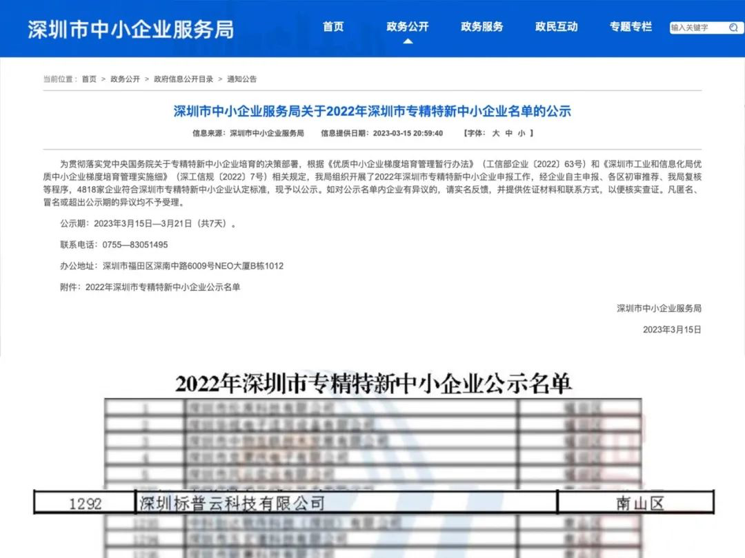 3月15日,深圳市中小企業(yè)服務(wù)局公示了“2022年深圳市專精特新中小企業(yè)名單”,標(biāo)普云榜上有名!
