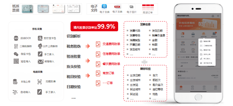識別字段全:識別票據(jù)或單據(jù)上除密文區(qū)外所有的字段信息,包括發(fā)票代碼、發(fā)票號碼、消費類型、消費金額、發(fā)生日期/城市、出發(fā)及到達(dá)城市/站等十幾種內(nèi)容信息;