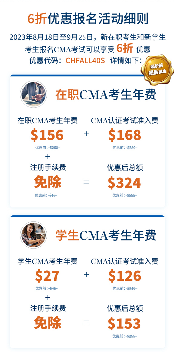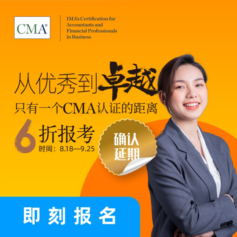 為幫助財(cái)務(wù)專業(yè)人士學(xué)習(xí)管理會(huì)計(jì)知識(shí),提升職場競爭力和拓展職業(yè)人脈。本次“從優(yōu)秀到卓越,只有一個(gè)CMA認(rèn)證的距離”的6折優(yōu)惠活動(dòng)的截止日期將延期至9月25日。