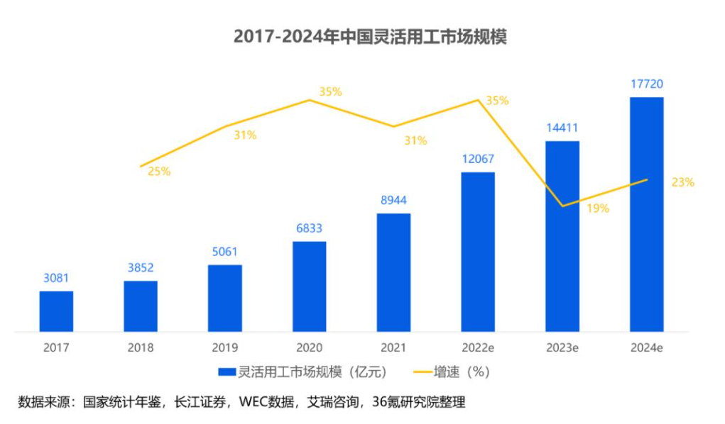 從市場滲透率角度看,我國靈活用工市場與發(fā)達(dá)國家相比,仍有較大差距:中國靈工市場滲透率不足10%,而發(fā)達(dá)國家普遍在30%-40%。這一差異主要在于我國由服務(wù)業(yè)發(fā)展驅(qū)動帶來的靈活用工需求仍處于較為早期階段,而這也意味著我國靈活用工市場存在巨大發(fā)展?jié)摿Α暮暧^經(jīng)濟(jì)角度來看,經(jīng)濟(jì)不確定性的增強(qiáng)為各行各業(yè)帶來了較大挑戰(zhàn),以較低成本快速匹配人才的用工需求將驅(qū)動行業(yè)迅速發(fā)展。預(yù)計(jì)2024年,我國靈活用工市場規(guī)模將突破1.7萬億。