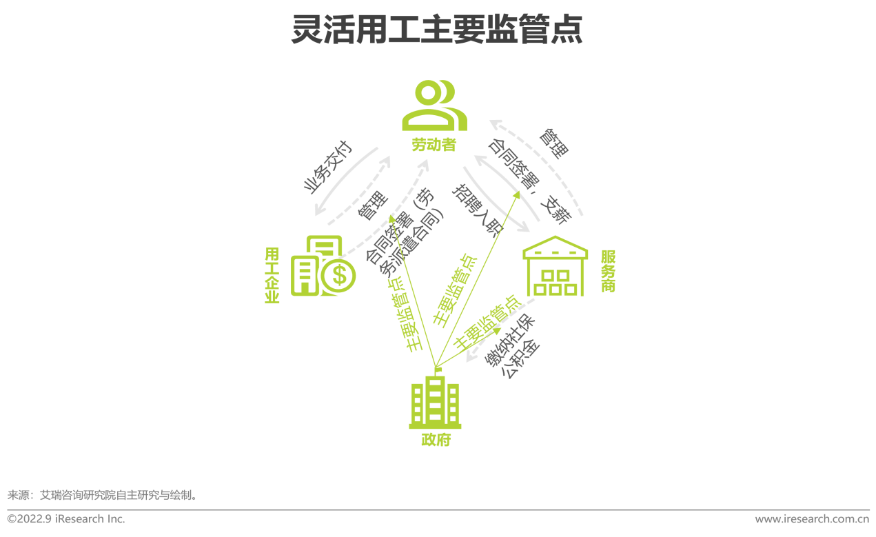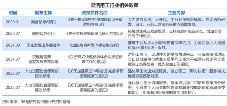 2020年,商務(wù)部等八部門出臺了《關(guān)于推動服務(wù)外包加快轉(zhuǎn)型升級的指導(dǎo)意見》;同年,國務(wù)院辦公廳出臺了《關(guān)于支持多渠道靈活就業(yè)的意見》;2021年,國家發(fā)展改革委員會等部門又出臺了《加快培育新型消費(fèi)實(shí)施方案》;2022年,人力資源社會保障部,民政部等部門出臺了《關(guān)于加強(qiáng)零工市場建設(shè)完善求職招聘服務(wù)的意見》;2023年,國家發(fā)布了《中共中央 國務(wù)院關(guān)于促進(jìn)民營經(jīng)濟(jì)發(fā)展壯大的意見》,其中不僅提到“鼓勵(lì)民營企業(yè)開展數(shù)字化共性技術(shù)研發(fā);支持中小企業(yè)數(shù)字化轉(zhuǎn)型”;還說要“引導(dǎo)平臺經(jīng)濟(jì)向開放、創(chuàng)新、賦能方向發(fā)展,補(bǔ)齊發(fā)展短板弱項(xiàng),支持平臺企業(yè)在創(chuàng)造就業(yè)、拓展消費(fèi)、國際競爭中大顯身手,推動平臺經(jīng)濟(jì)規(guī)范健康持續(xù)發(fā)展。”這些與靈活用工行業(yè)相關(guān)的政策,展示了黨和國家對行業(yè)升級轉(zhuǎn)型,進(jìn)一步發(fā)展的鼓勵(lì)和支持。