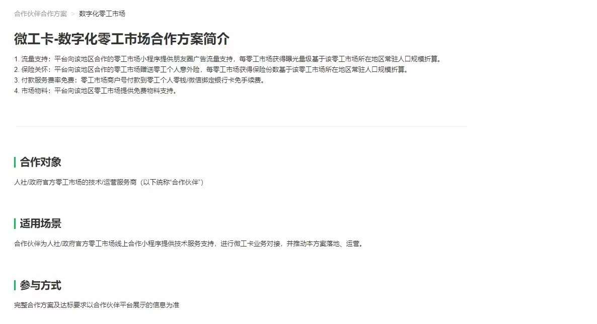 據(jù)了解,微信支付官方指導(dǎo)建設(shè)的零工市場(chǎng)小程序,只要完成微工卡實(shí)名,且具備發(fā)薪、投保、簽約至少兩項(xiàng)能力,即可申請(qǐng)相應(yīng)的朋友圈推廣流量與日結(jié)保險(xiǎn)。具體申請(qǐng)可由提供技術(shù)服務(wù)支持的服務(wù)商在微信支付合作伙伴平臺(tái)完成。自2023年11月1日起至2024年10月31日,各地服務(wù)商均可報(bào)名,資源自報(bào)名通過日后1年有效。2021年,微信支付上線“微工卡”數(shù)字化解決方案,通過集成了騰訊電子簽、騰訊微保、法大大等生態(tài)合作伙伴一起打造了簽約、考勤、保障、結(jié)算等一系列數(shù)字化能力,為零工就業(yè)保障提供了數(shù)字化工具箱。各地官方零工市場(chǎng)在提供可靠、真實(shí)的工作崗位的同時(shí),通過“微工卡”工具箱線上簽約的能力,務(wù)工者和用人單位也能簽訂一份有法律效益的用工協(xié)議,保障雙方權(quán)益。微信支付注冊(cè)服務(wù)商均可登錄微信支付合作伙伴平臺(tái),通過“合作伙伴能力-合作方案介紹-微工卡”查看。
