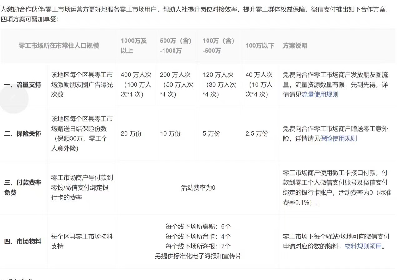 自2022年人社部等五部門印發(fā)《關(guān)于加強(qiáng)零工市場(chǎng)建設(shè) 完善求職招聘服務(wù)的意見》以來,各地大力探索零工市場(chǎng)建設(shè),并積極通過微信小程序、社群等方式,探索新型的“數(shù)字化零工市場(chǎng)”,提升零工就業(yè)需求對(duì)接、保障零工群體就業(yè)權(quán)益。與此同時(shí),微信支付推出的“微工卡”解決方案,提供了簽約、打卡、靈活結(jié)算、日結(jié)保險(xiǎn)等“一站式”零工保障數(shù)字工具箱——如浙江杭州“星工驛站”小程序,已為靈活就業(yè)群體創(chuàng)造增收446萬元;浙江”嘉善零工“一個(gè)月幫助超過800位求職者成功上崗;廣東郵政攜手微信支付推出零工市場(chǎng)數(shù)字化平臺(tái)“郵薪領(lǐng)”……找零工這件事兒正在變得更”靠譜“。重點(diǎn)助力數(shù)字零工市場(chǎng)推廣與零工保障微信支付所投入的1000萬將用于”零工保障“計(jì)劃,面向全國(guó)各地人社部門或政府官方主辦的零工市場(chǎng)小程序,重點(diǎn)圍繞線上數(shù)字化零工市場(chǎng)推廣、零工群體保險(xiǎn)保障提供支持。以數(shù)字零工市場(chǎng)推廣為例,微信支付將為地區(qū)合作的零工市場(chǎng)小程序提供朋友圈廣告流量支持,朋友圈曝光量級(jí)基于該零工市場(chǎng)所在地區(qū)常駐人口規(guī)模折算,幫助更多人微信中就能找到”家門口的工作“。與此同時(shí),零工群體的保障也備受關(guān)注。微信支付將為合作零工市場(chǎng)贈(zèng)送零工個(gè)人意外險(xiǎn),物流、餐飲服務(wù)、會(huì)展地推、家政保潔、辦公室文員、工廠操作工等常見職業(yè)范圍均能覆蓋,讓”打零工“這件事情有保障。除此以外,零工市場(chǎng)商戶使用”微工卡“接口付款到零工微信支付賬戶,活動(dòng)費(fèi)率為0。